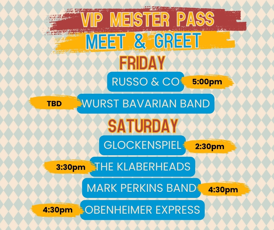 Meet some of your favorite Bavarian bands, local celebs and personalities. Take group photos, selfies, or have them sign your stein! Below is this year's schedule.